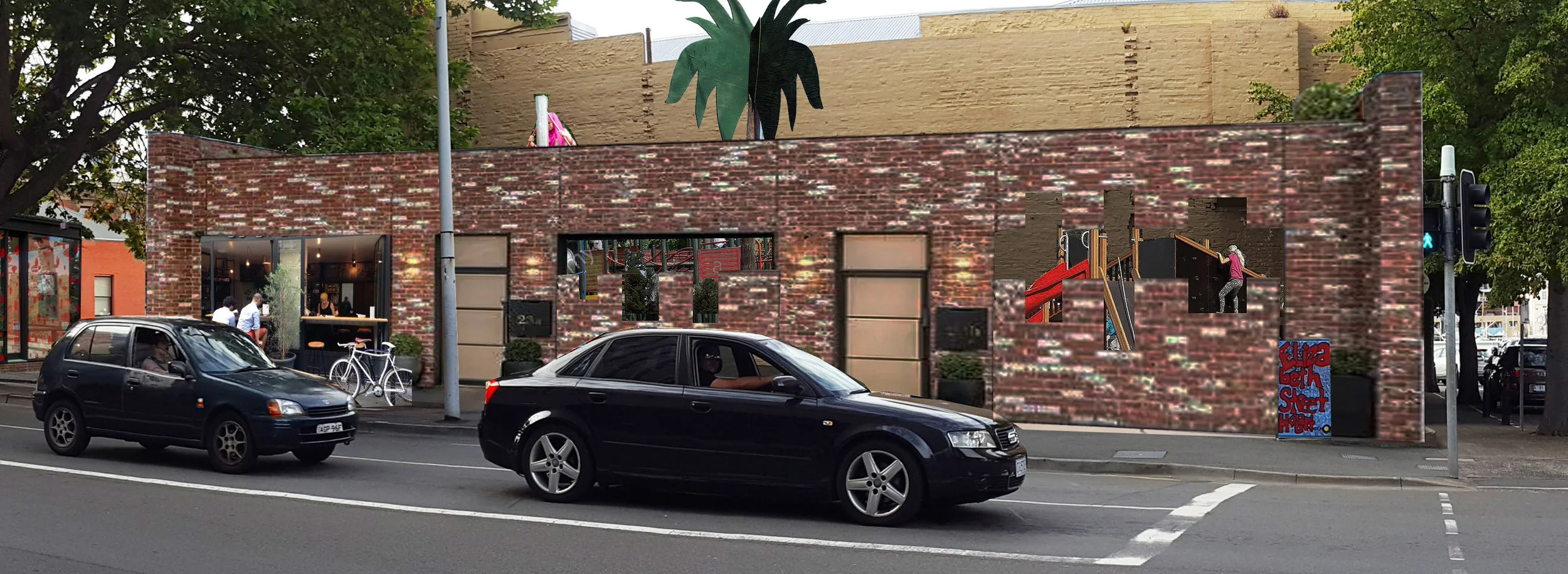 Next to the pavilion, the sound of traffic is replaced by that of children playing within a new enclosed playground. On a narrow site currently used for car parking, a much needed playground is formed by the existing walls of the Heritage Buildings and a new set of perforated brick walls. Accessed solely via a narrow lane which runs past a small cafe next to the Pavilion, the playground provides a safe environment for children whilst also allowing parents to take time out over a coffee in the knowledge that the children are busy playing in safety.